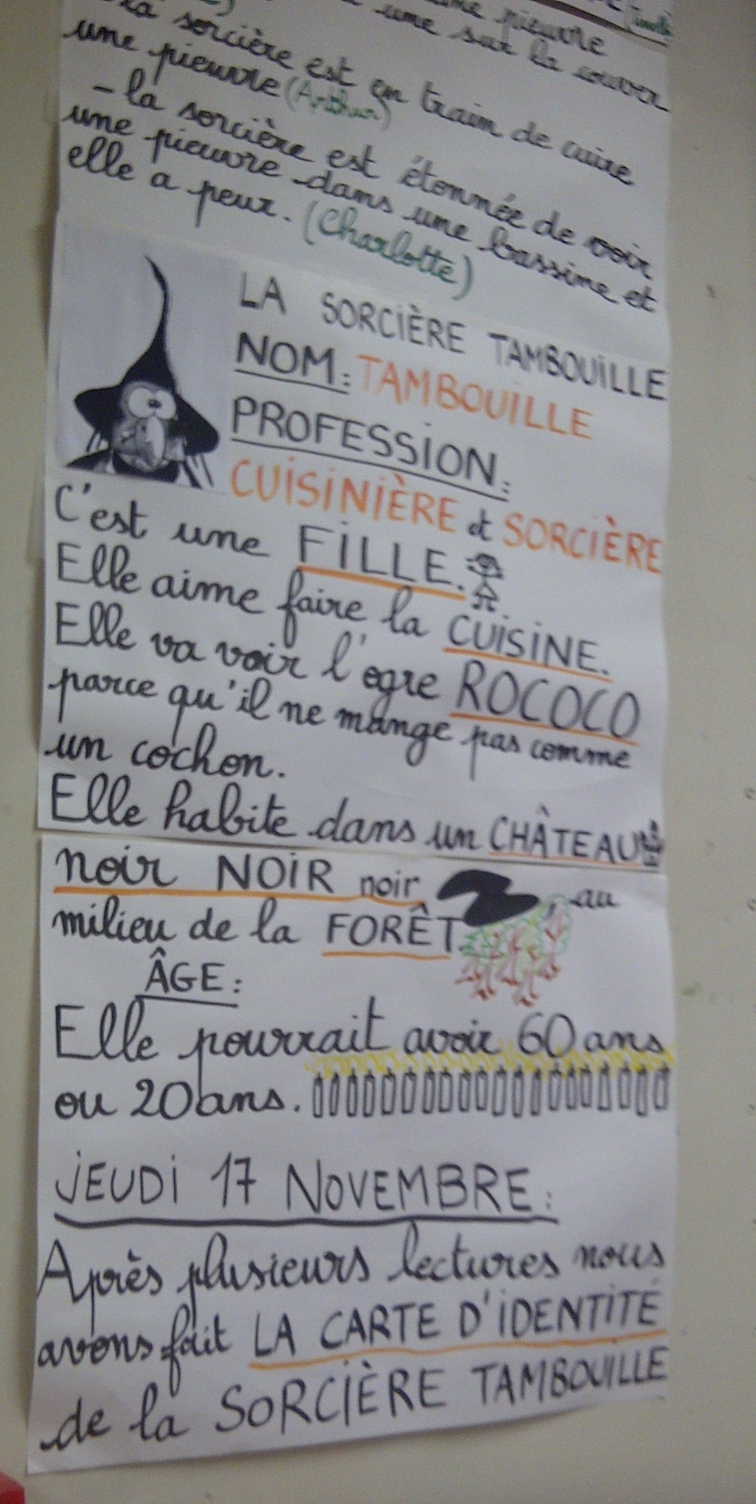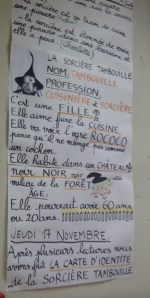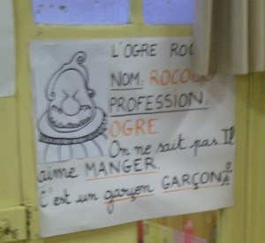 J’ai pu constater que les stéréotypes de genre sont déjà très prégnants; dans les panneaux dictés par les enfants, l’ogre aime manger, c’est un garçon; la sorcière est cuisinière, c’est une fille – par contre, elle a 20 ans ou 60 ans, le stéréotype de l’âge paraît moins tenace que celui de genre…